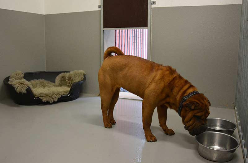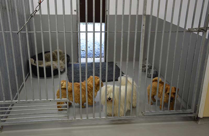 Hundene har direkte tilgang til egen liten luftegård gjennom luke i veggen utenfor plassen sin.